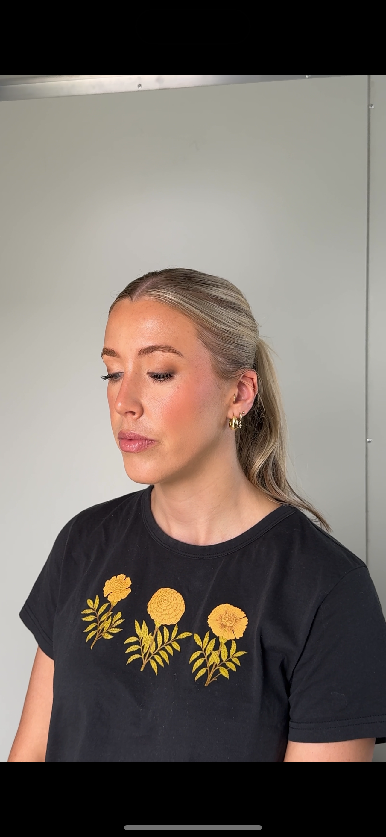 A woman with blonde hair pulled back, wearing gold earrings and a black t-shirt with yellow floral embroidery, looks downward with a neutral expression.