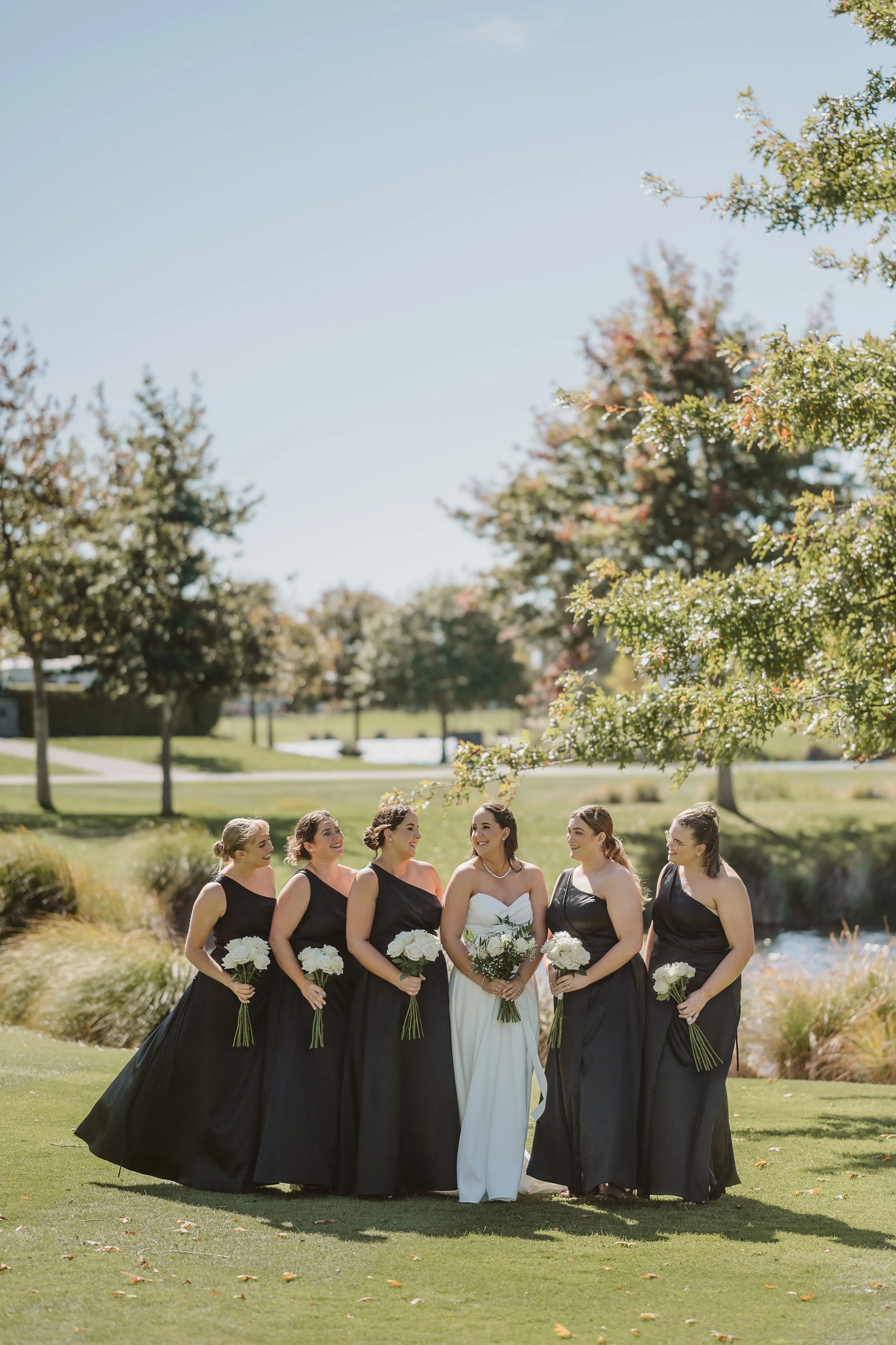 A bride and five bridesmaids standing outdoors on a sunny day, each holding white bouquets, with trees and a pond in the background.