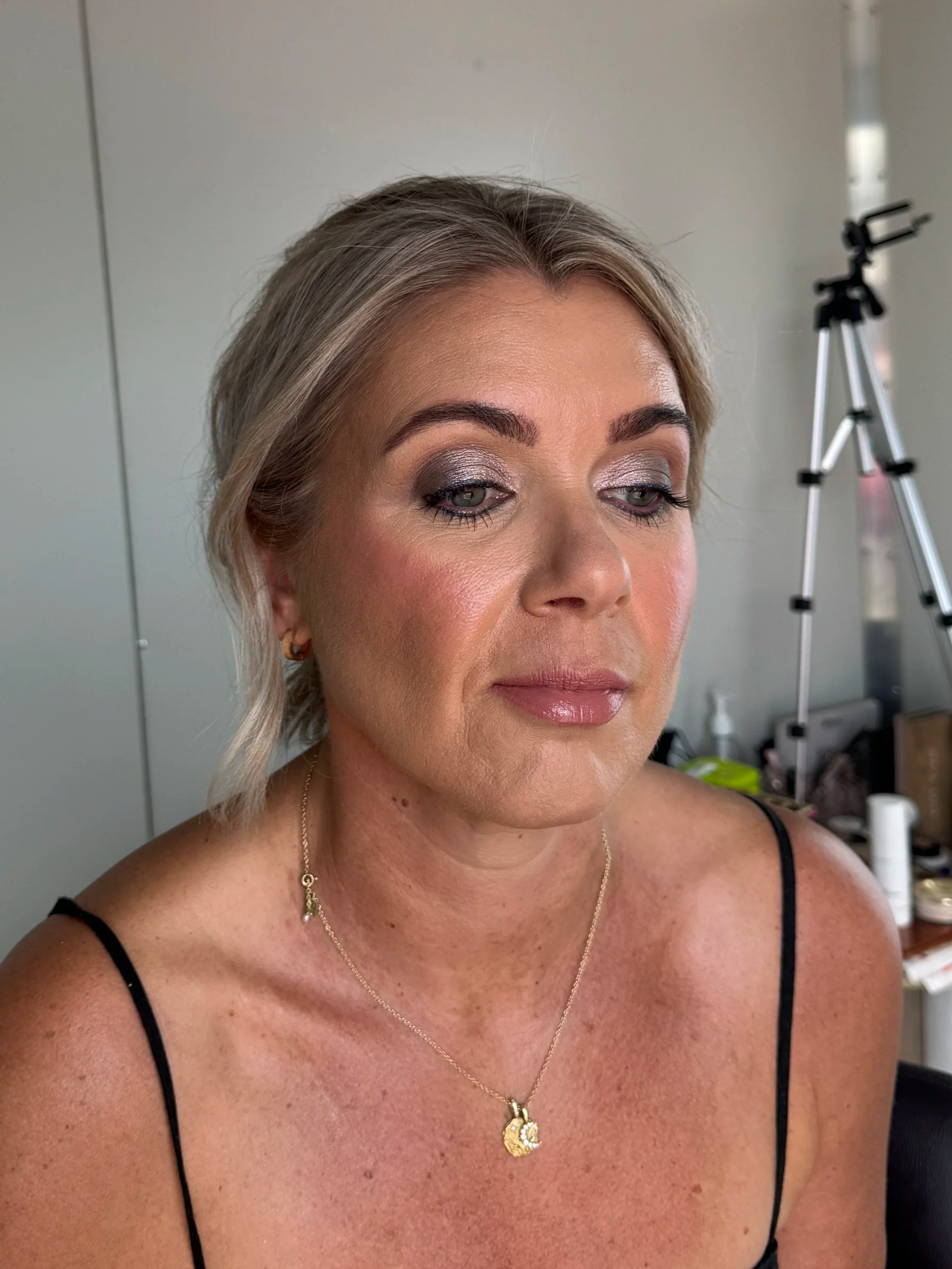 Close-up of a woman with blonde hair, makeup, and wearing a necklace, in a room with a camera tripod and makeup products in the background.