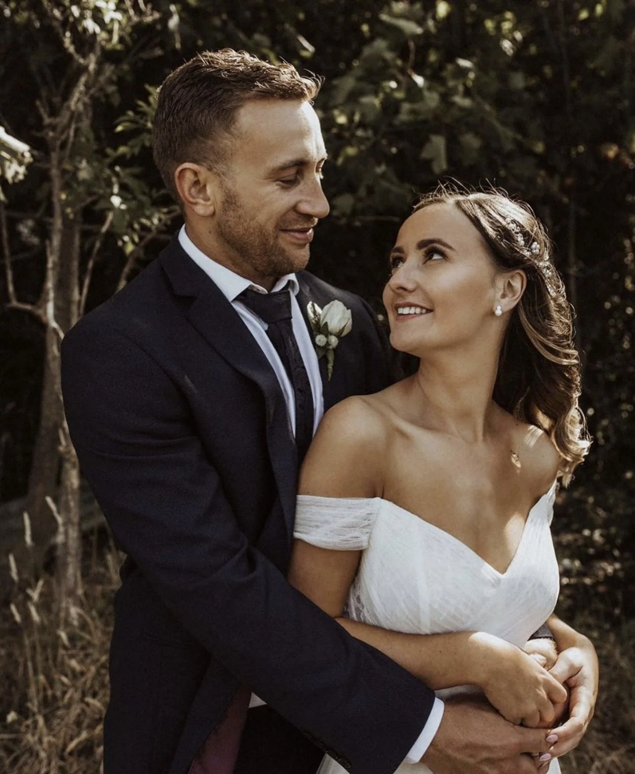 A couple in wedding attire standing outdoors, the groom in a dark suit and the bride in a white off-shoulder wedding dress, gazing at each other affectionately.
