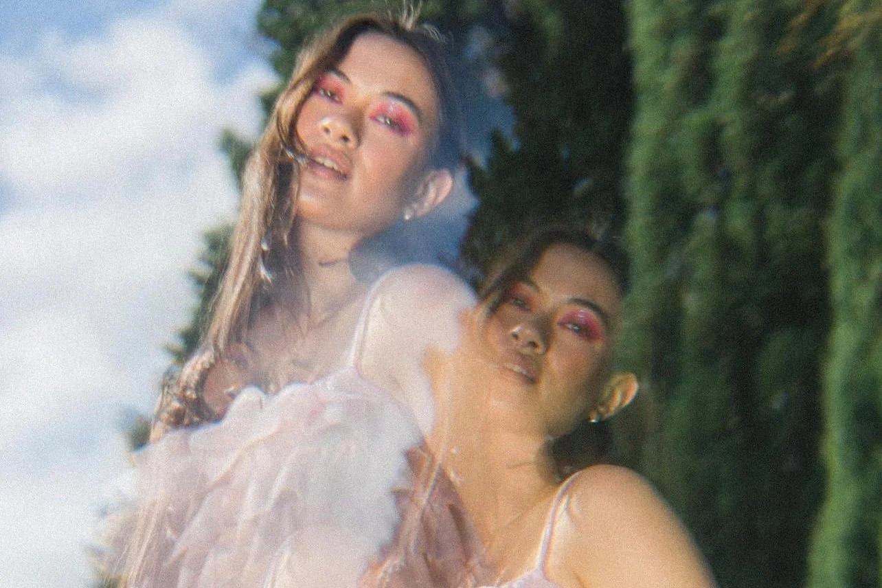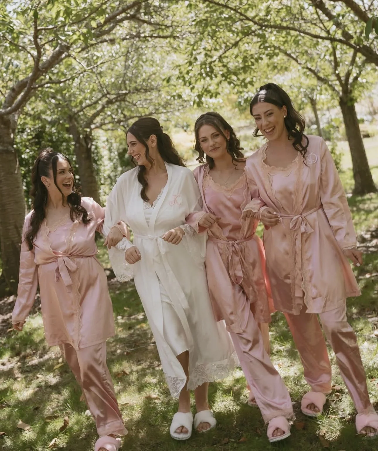 Four women dressed in matching pink satin pajamas and one woman in a white satin robe, walking arm-in-arm outdoors on a sunny day, surrounded by green trees.