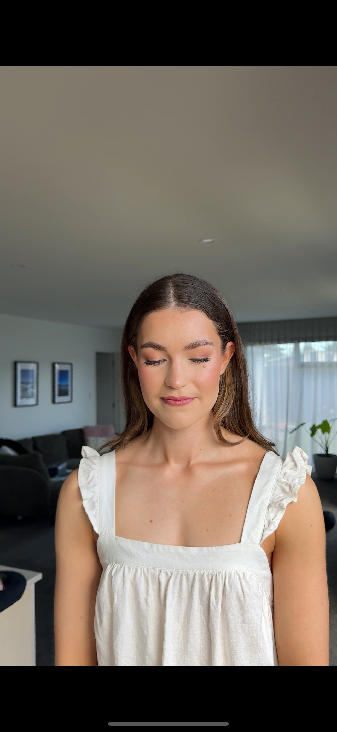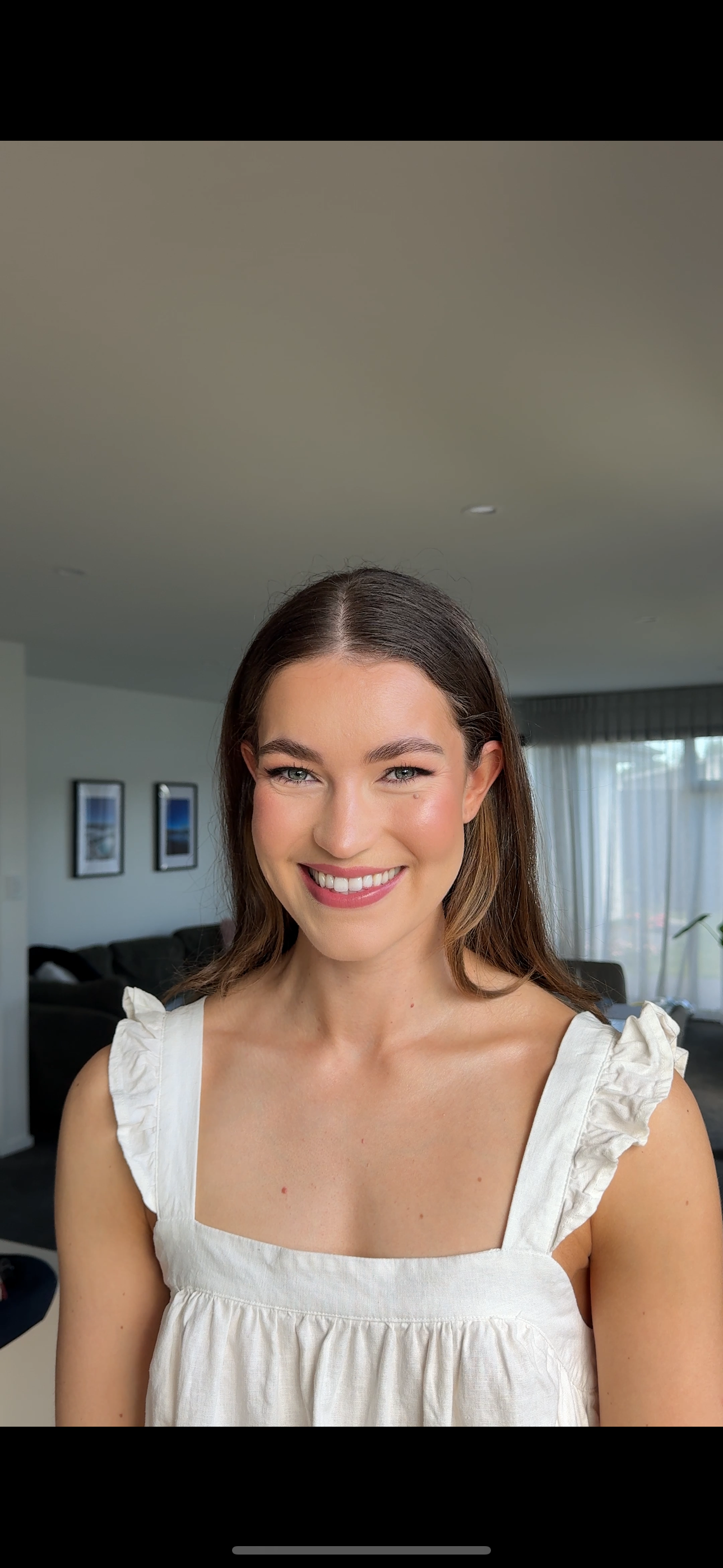 A young woman with long brown hair and blue eyes smiling in a well-lit living room, wearing a white ruffled sleeveless top.