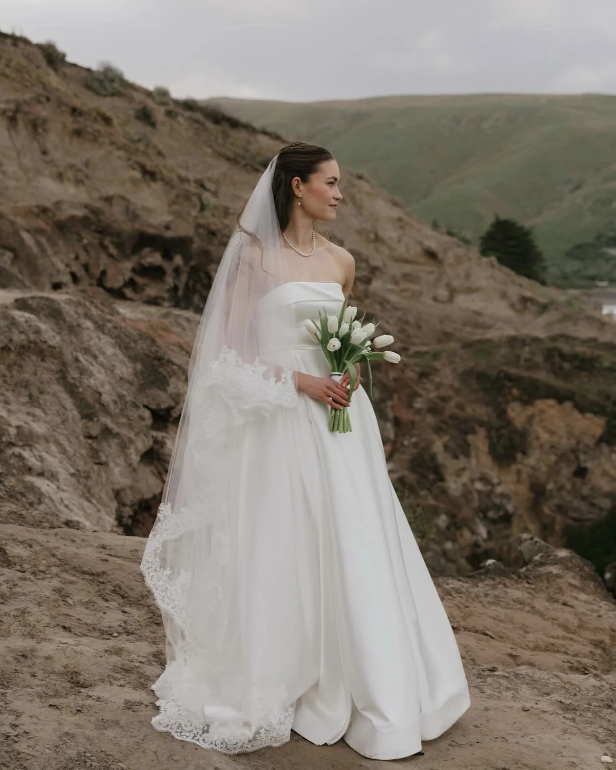 A bride in a white wedding gown, veil, and pearl necklace holding a bouquet of white tulips, standing outdoors near water.