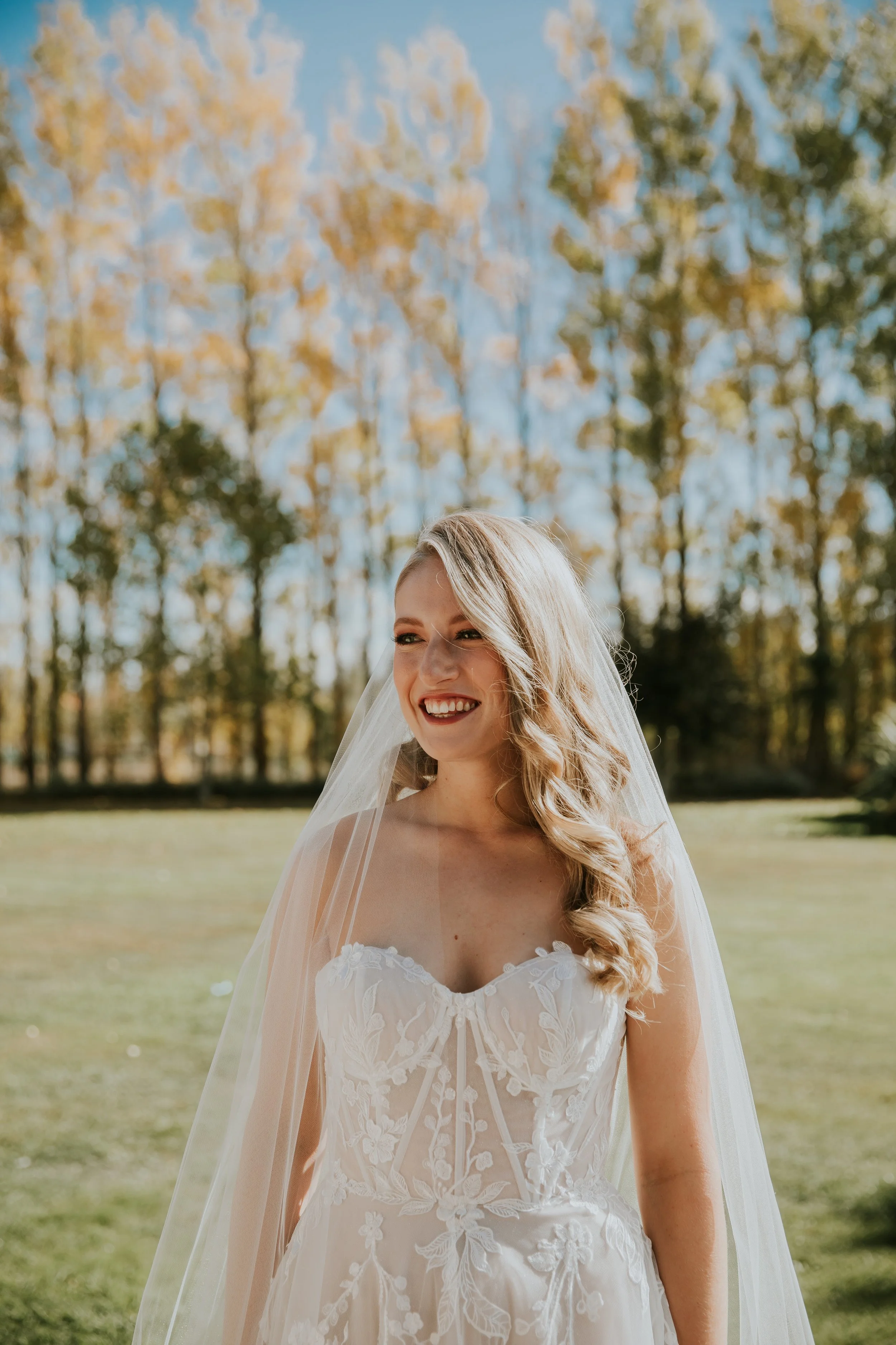 A smiling bride in a lace wedding dress with a veil, standing outdoors on a sunny day with trees and blue sky in the background.