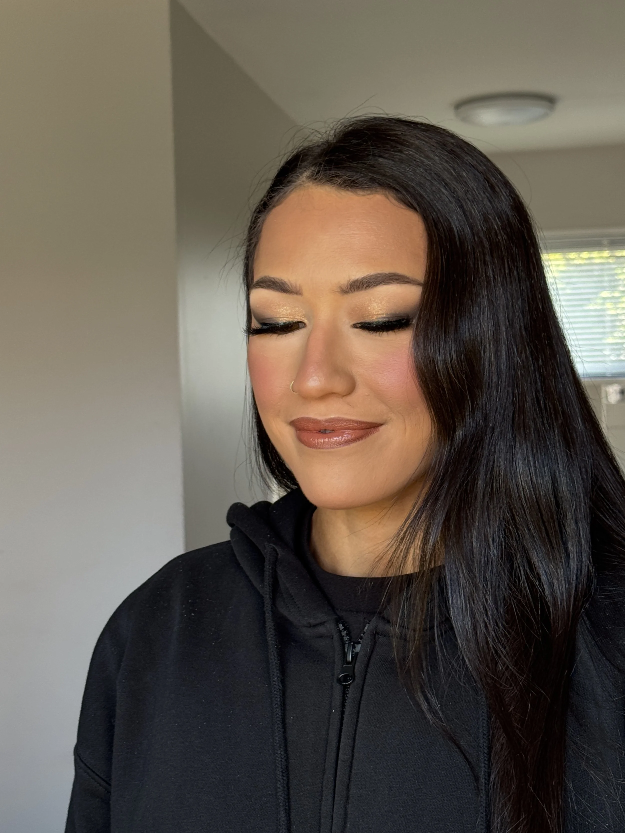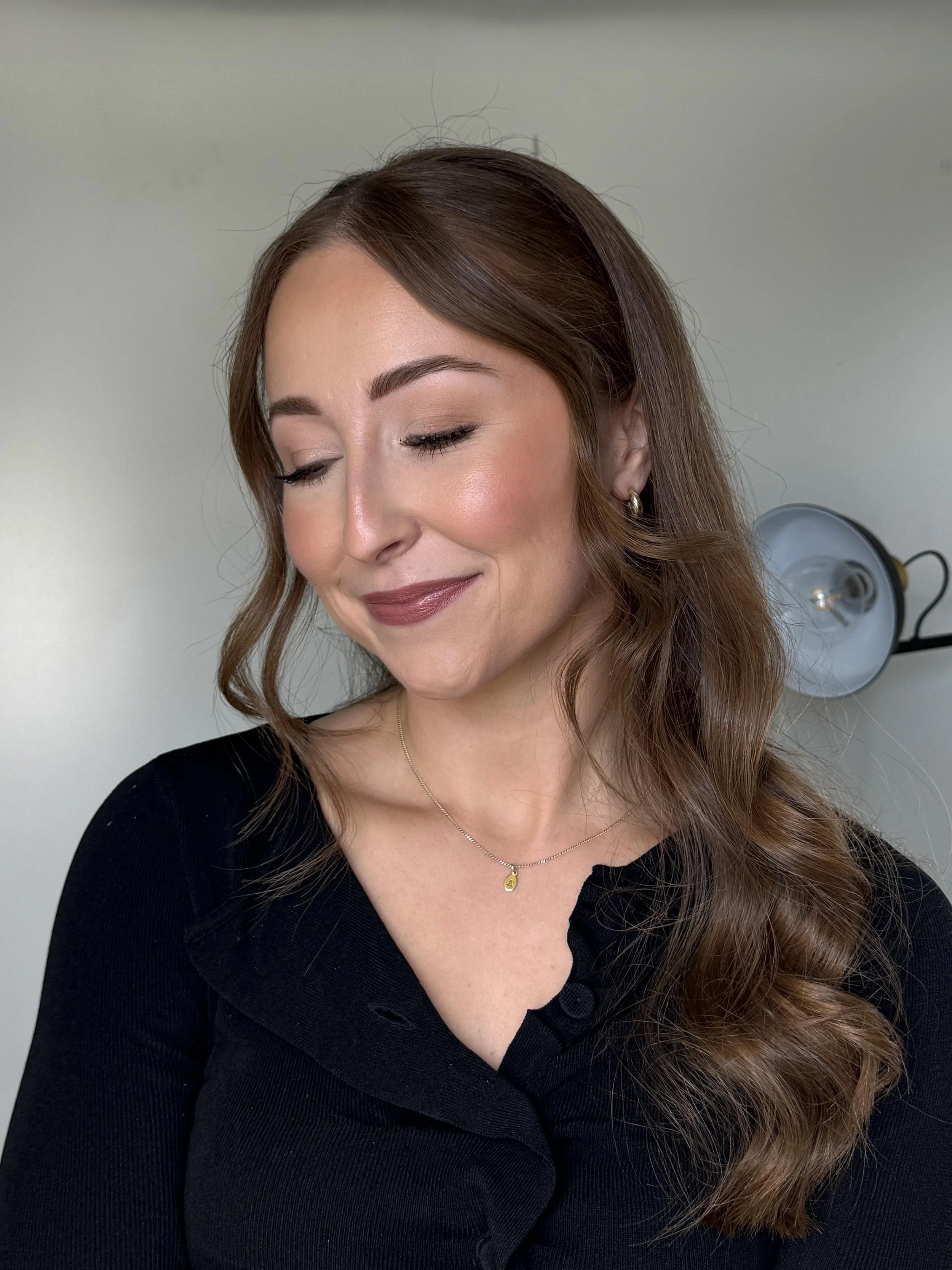 A woman with long brown hair styled in loose waves, wearing a black top, gold hoop earrings, and a delicate gold necklace with a small pendant. She has makeup with a natural look, including foundation, blush, eye makeup, and lipstick, and she is smil
