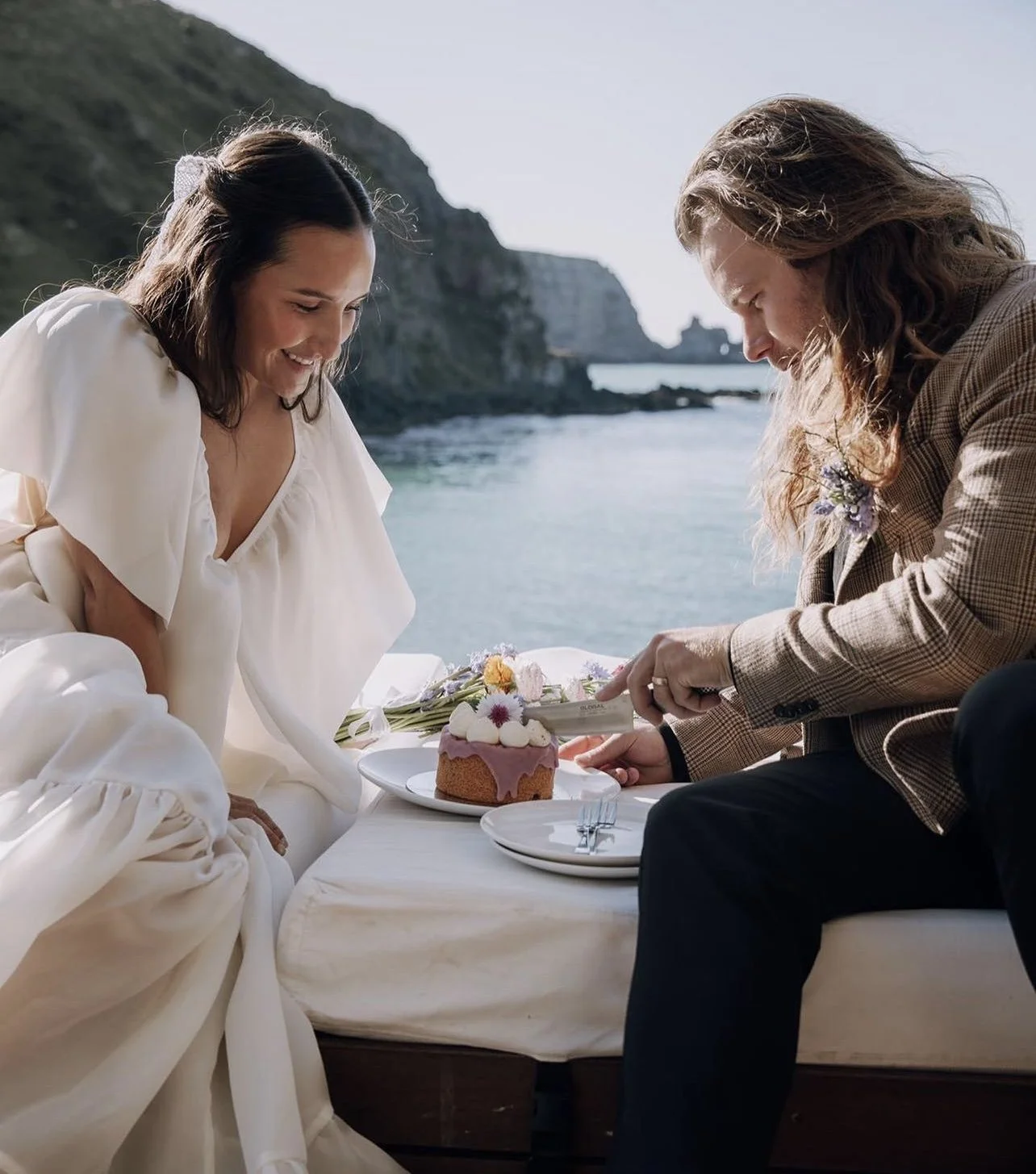 A couple celebrating at a seaside outdoor location with a cake decorated with flowers, sharing a joyful moment.