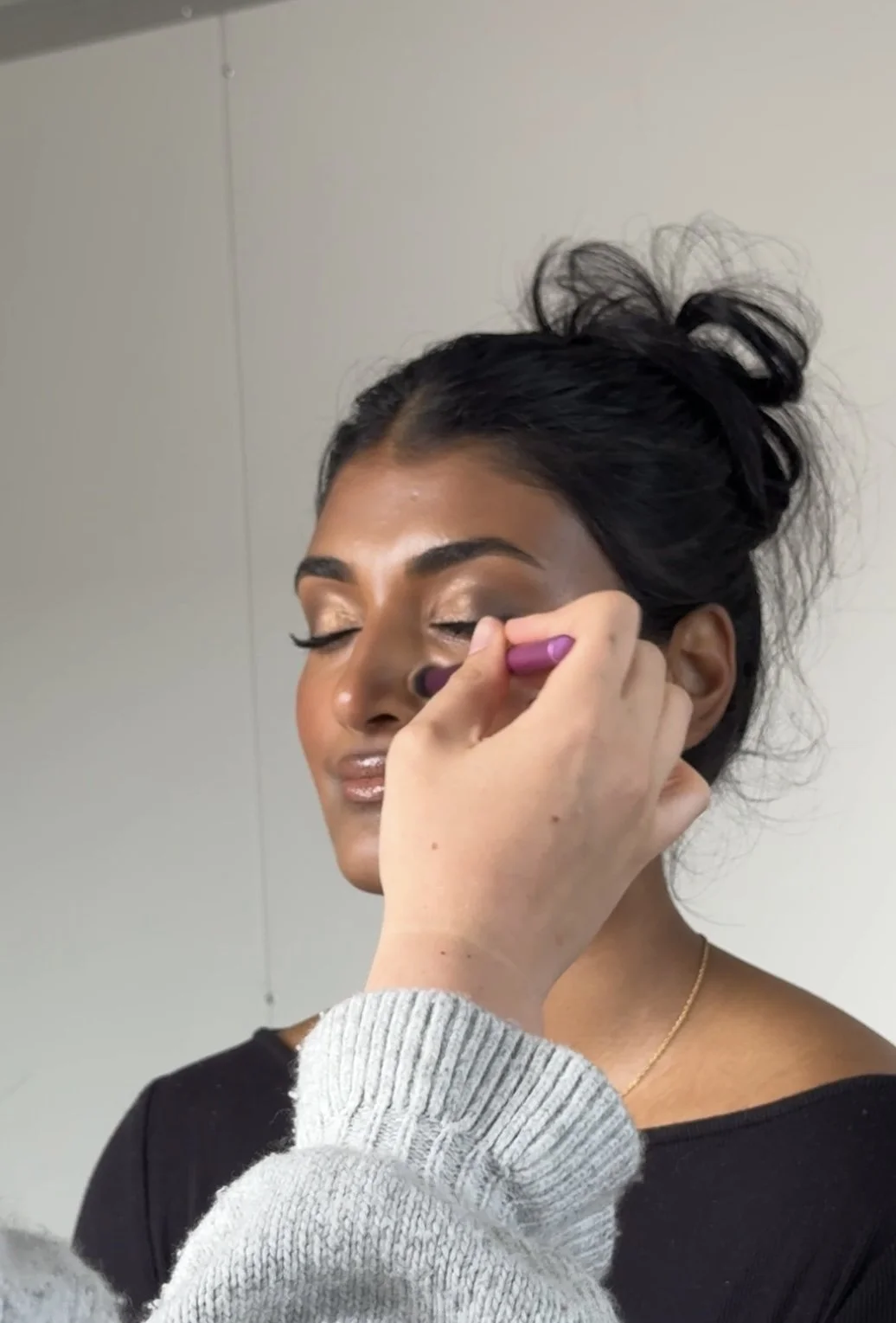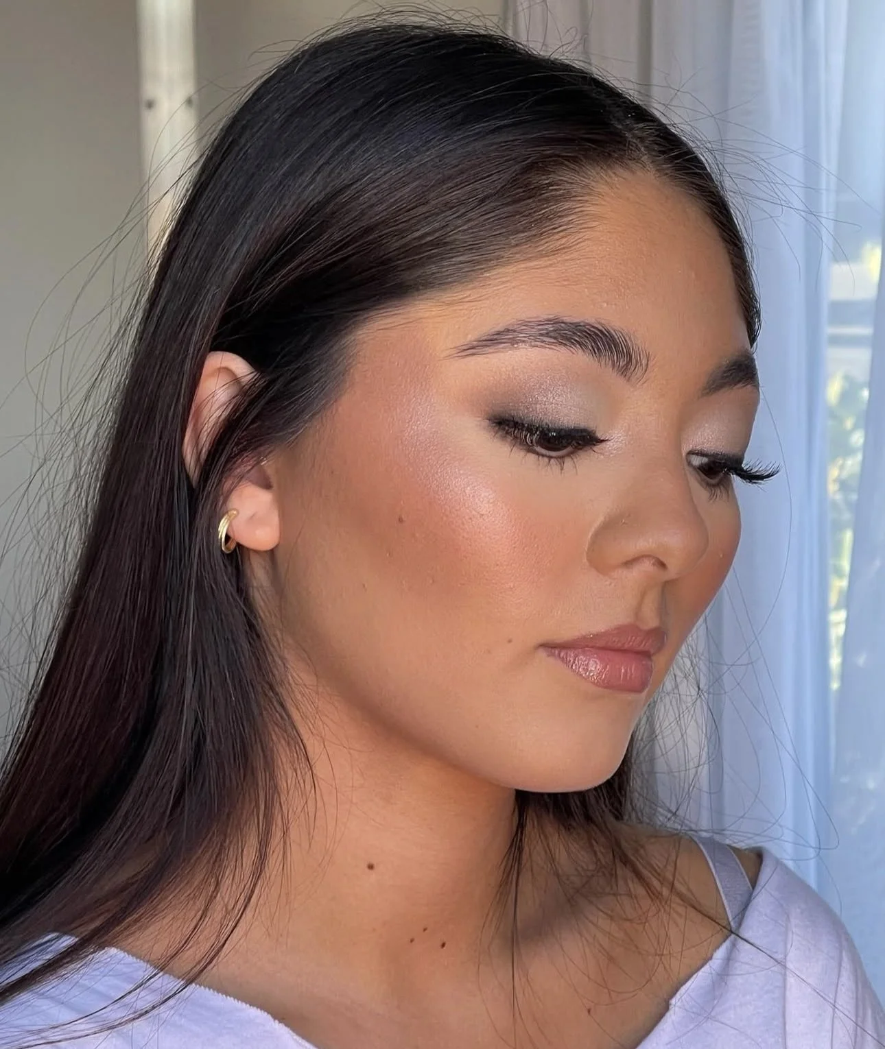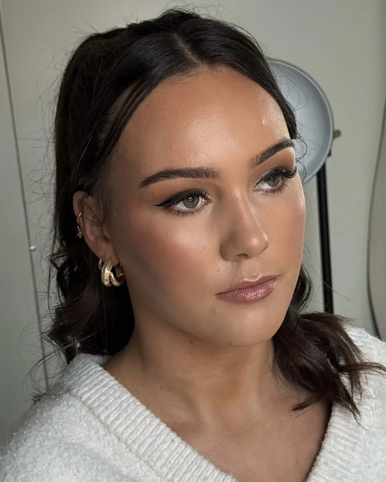 Close-up of a woman with dark, wavy hair, makeup, and earrings, sitting in front of a mirror.