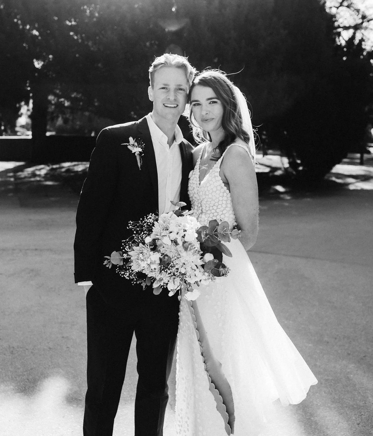 A black and white photo of a bride and groom standing outdoors. The man is dressed in a suit with a boutonniere, and the woman is in a wedding dress holding a bouquet of flowers. They are smiling and backlit by the sun with trees in the background.
