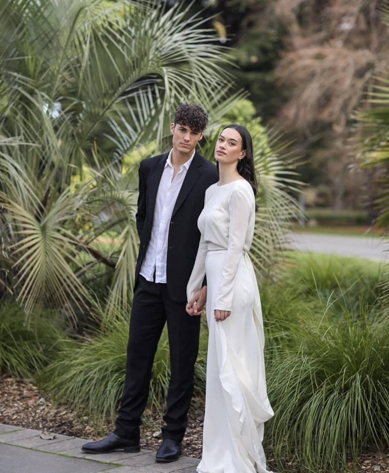 A young couple dressed in formal attire holding hands outdoors in front of green foliage and trees.