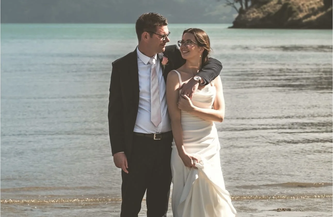 A bride and groom standing on the beach, the groom with his arm around the bride's shoulder, both smiling and looking at each other, with water and distant landscape in the background.