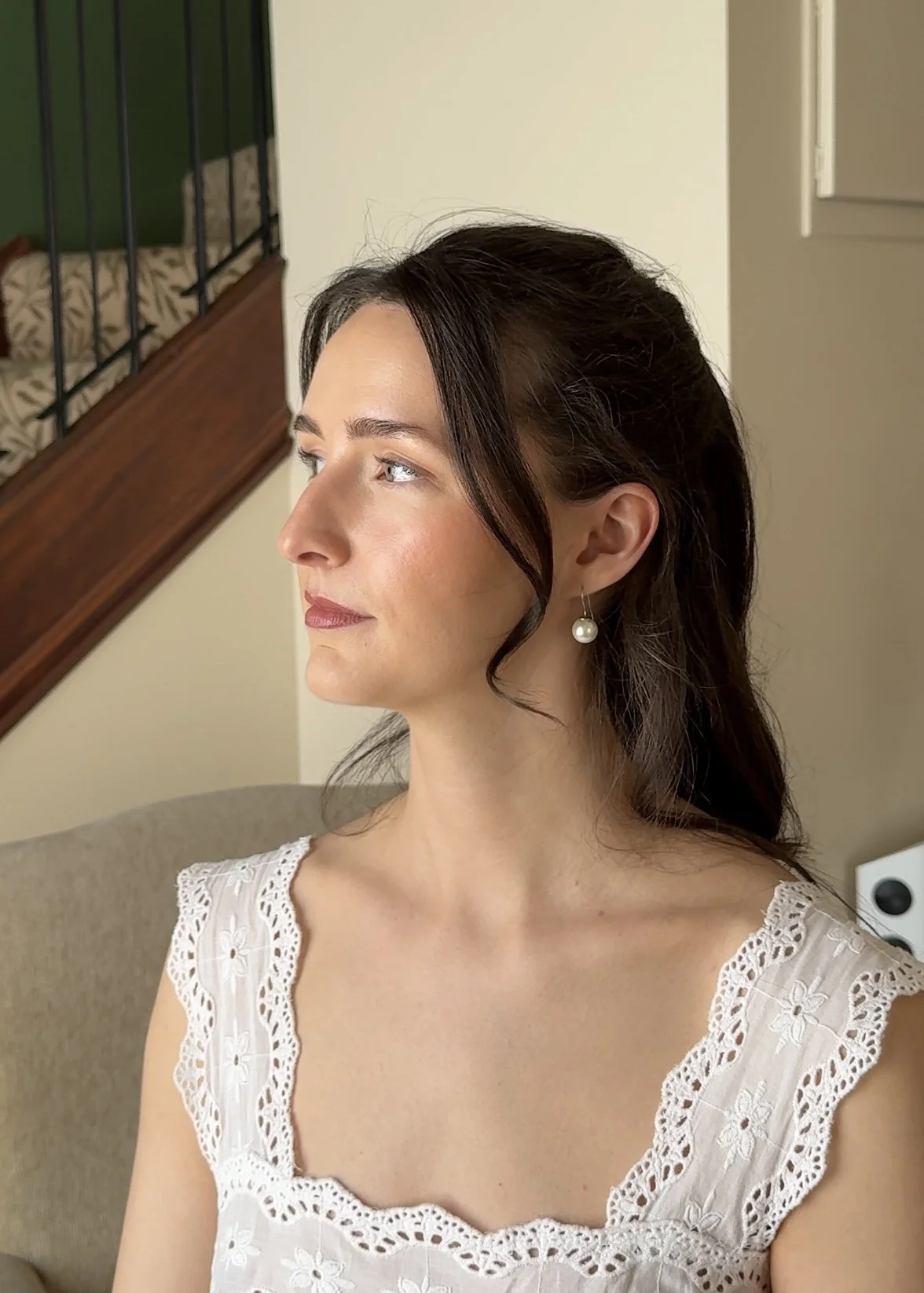 A woman with dark hair, wearing pearl earrings and a white embroidered top, sitting indoors near a staircase, looking to the left.